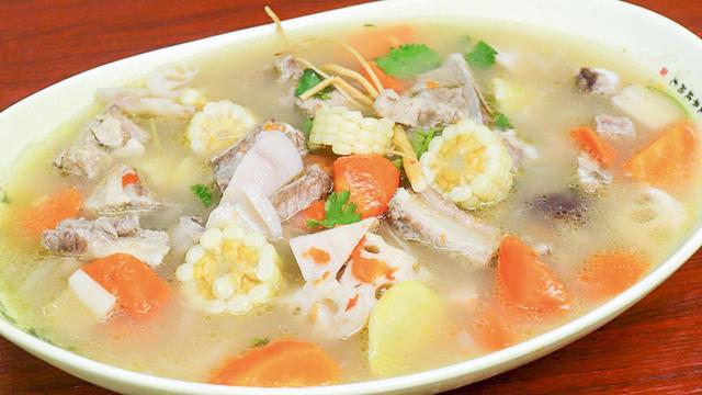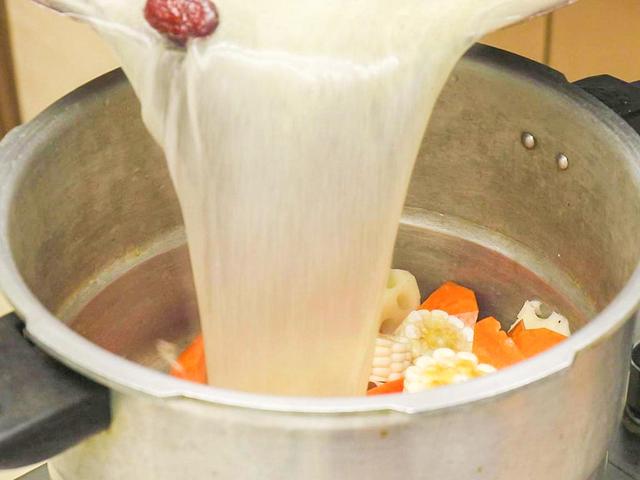 4.然后取出高压锅把莲藕、玉米、胡萝卜放进去,再倒入排骨上气后小火炖20分钟,20分钟以后打开锅盖调味,加入食盐、少许白糖提鲜、胡椒粉、鸡粉搅匀,美味即成。