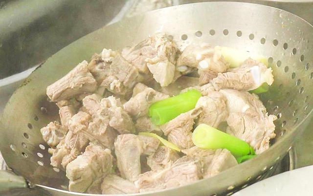 2.起锅烧水,凉水时倒入排骨、葱段和姜片,然后淋入适量料酒去腥,大火烧开以后煮出里面的血水和杂质,大约煮2分钟把排骨倒出来,用清水冲洗干净沥水备用。