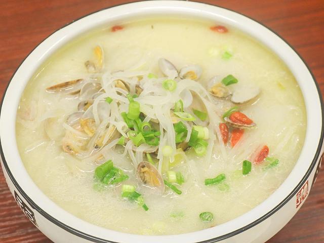 3.锅内烧油,放入葱姜爆香,再抓入一小撮面粉熬成面油,然后倒入清水放入花甲,再加入半勺三花淡奶增加浓香的口感,加入食盐、鸡粉、少许味精、胡椒粉调味搅拌化开调料,汤汁烧开以后下入萝卜丝大火沸腾一会儿,最后撒入几粒枸杞即可出锅。